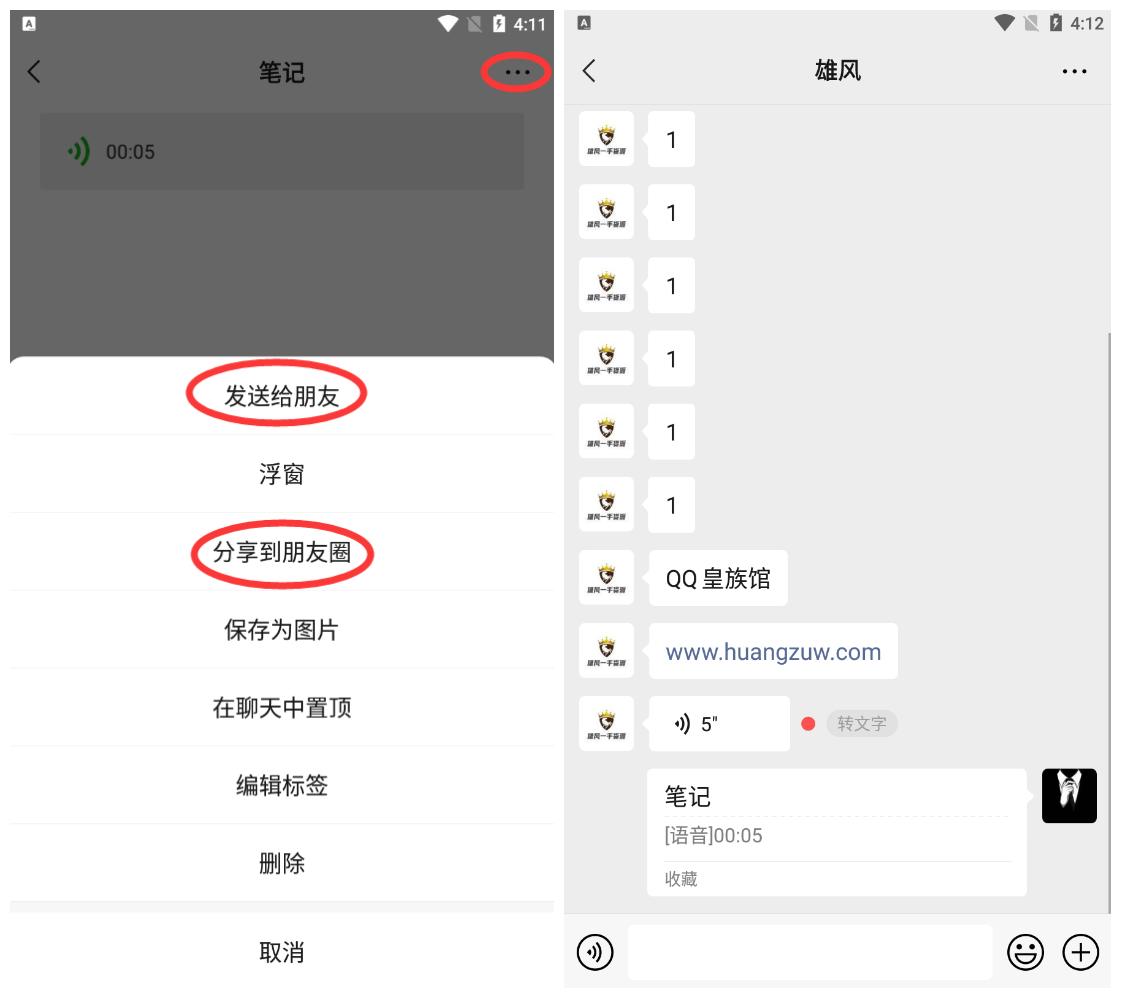 2、转存成笔记后,点击笔记那一条,再点击右上角[...]就可以直接转发给好友或朋友圈了,转发给好友后可以播放微信语音了。