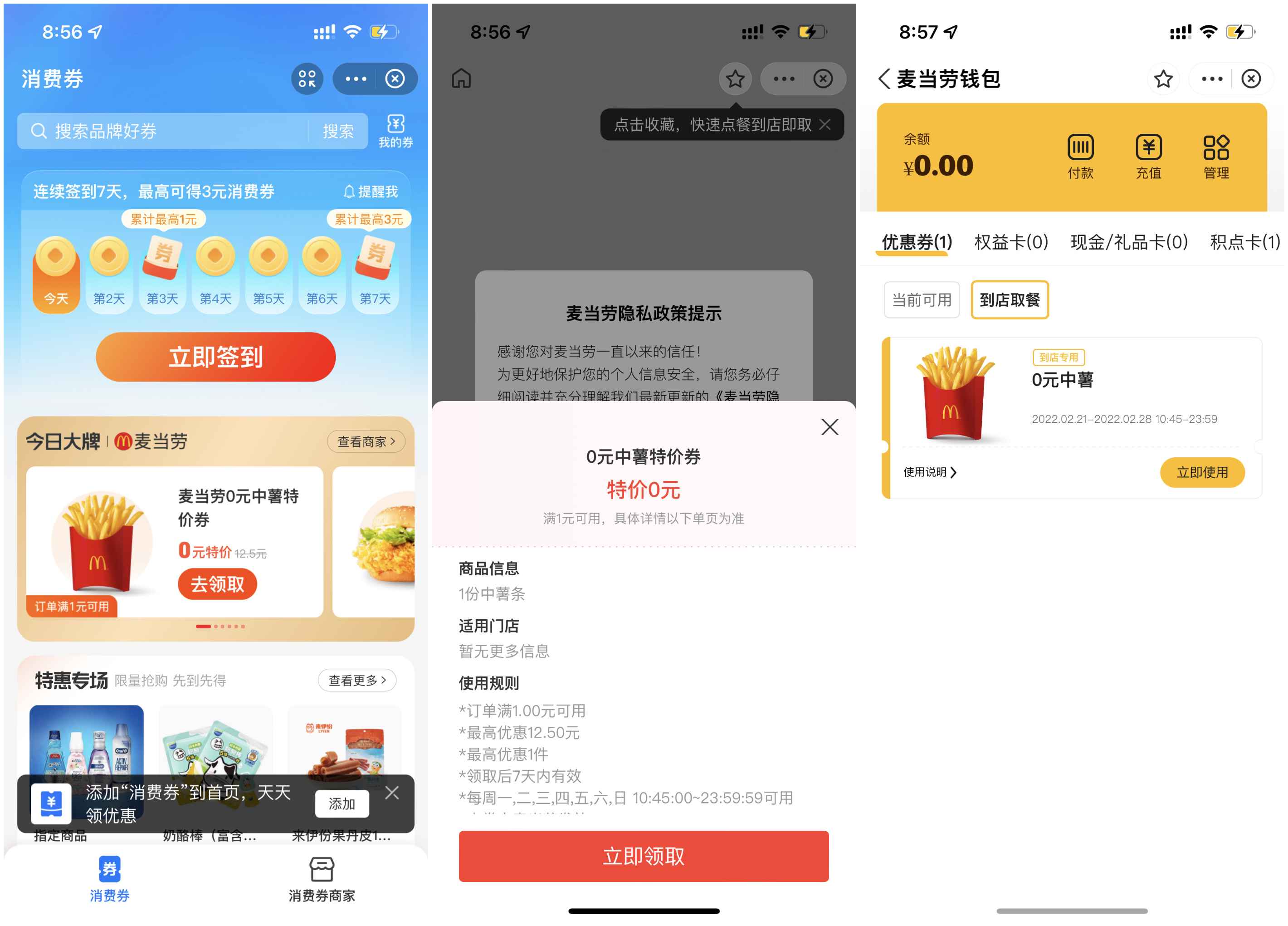 本文是在支付宝消费券里面可以免费领取麦当劳0元中薯条特价券;领取后7天内有效,需要任意消费订单满1元可以使用,喜欢吃薯条的领取下。