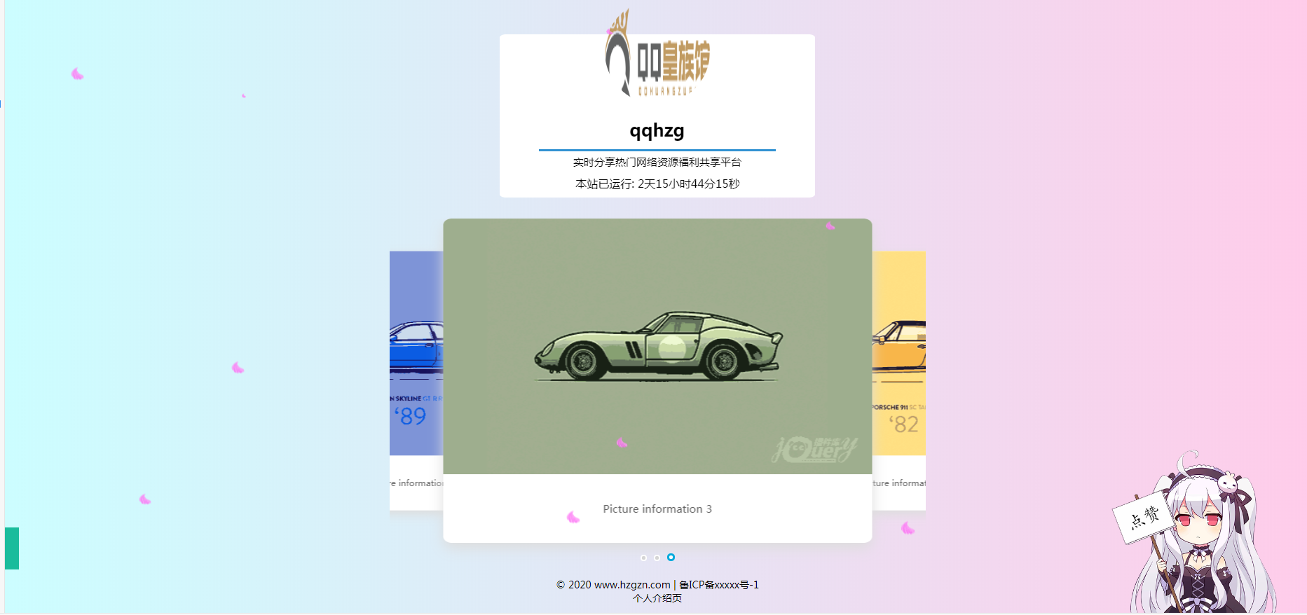 一款有音乐,有花瓣飘落,有看板娘,还有轮播图,轮播图可以添加跳转链接;非常实用的个人介绍html导航页面,大家需要的自行下载搭建!