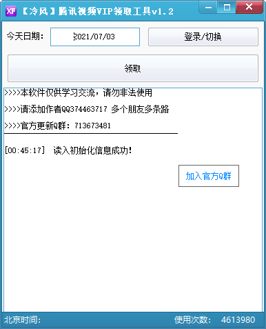 本次为大家分享的是冷风腾讯视频VIP领取工具v1.2 一号三次